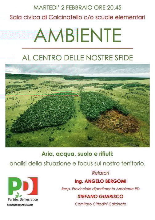 Bella responsabilità quella che gli amici del circolo del PD di Calcinato mi assegnano. Domani sera presso la sala civica di Calcinatello dialogherò con loro e con le realtà locali dei comitati sui principali temi di carattere ambientale che riguardano non solo quella zona ma l'intera Provincia.