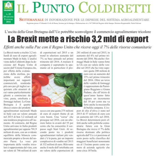 Traggo spunto dall'organo di stampa settimanale della Coldiretti per inquadrare le conseguenze della cosiddetta "Brexit", ossia l'uscita del Regno Unito dalla Comunità Europea. Coldiretti ha quantificato le conseguenze economiche sulle imprese di uno dei comparti italiani più importanti, quello agroalimentare.