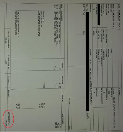 Qui accanto la scannerizzazione della "busta paga" da cui si evince che la somma dei gettoni di presenza dell'intero anno è di 143,21€. Ho presenziato a 6 sedute su 6 del consiglio comunale e a 3 commissioni consigliari (in sostituzione di altri consiglieri membri). Non rientrano in questi conteggi le sedute della commissione elettorale di cui sono membro effettivo e che non danno diritto a gettone di presenza.