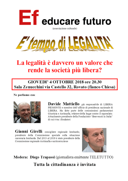 In collaborazione con l'associazione Educare Futuro giovedì 4 Ottobre alle ore 20.30 si discuterà del valore della LEGALITA' come imprescindibile caposaldo per una società più giusta e più equa.