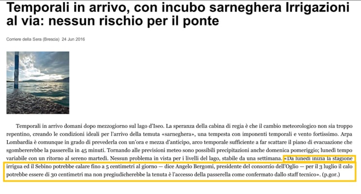 Lo staff ci ringraziò per aver fatto presente un dettaglio di cui non avevano tenuto conto. Noi prendemmo l'impegno di provare a tenere il livello del Sebino il più stabile possibile, stanti però gli obblighi verso le utenze del Consorzio che, lo ricordo, irrigano un comprensorio di ben 88.000 ettari nelle province di Brescia, Bergamo e Cremona.