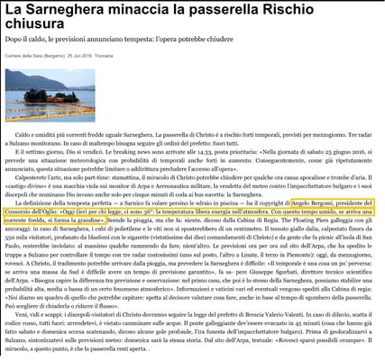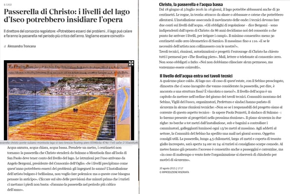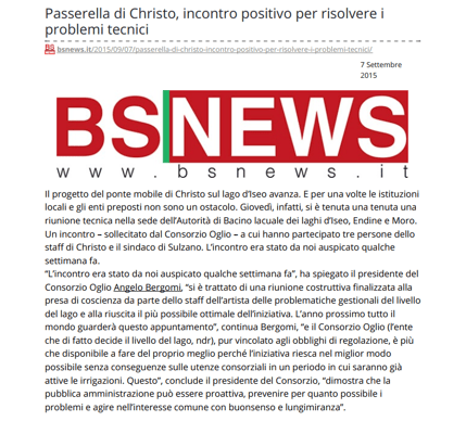 Quella esposizione ebbe una preparazione durata molto tempo. E anche il Consorzio dell'Oglio portò il suo contributo. Dopo una prima fase in cui il tema dei livelli del bacino lacustre non era stata compresa nei tavoli tecnici istituiti dalla Prefettura ci fu l'occasione per il Consorzio di incontrare la staff dell'artista. Ricordo che presso la sede dell'autorità di Bacino a Iseo, accompagnato dal direttore del Consorzio, ebbi l'opportunità di discutere con il nipote di Christo che coordinava la logistica dell'installazione. Fu un incontro molto pragmatico, dialogammo attraverso un interprete. Ricordo che comunicammo allo staff che nel periodo dell'apertura dell'opera (18/06/2016 - 03/07/2016) il livello del Sebino avrebbe potuto scendere anche di 70 centimetri, stante la partenza delle irrigazioni. Questo sarebbe stato un problema perchè alcuni dei sostegni utilizzati per stabilizzare la passerella sarebbero emersi dalle acque con un conseguente pregiudizio estetico per l'opera.