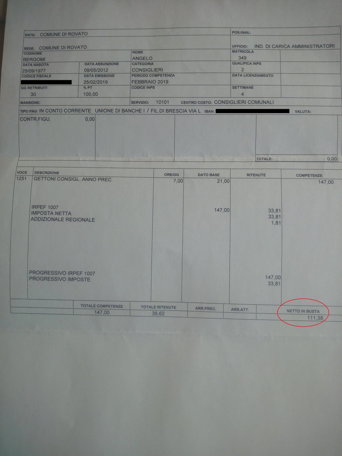 Pubblico per il dodicesimo anno consecutivo la "busta paga" da consigliere comunale. Lo faccio come sempre per trasparenza nei confronti dei cittadini ma anche per far capire che il motore che spinga all'impegno pubblico, soprattutto da minoranza, non sono queste indennità. Ma la passione.